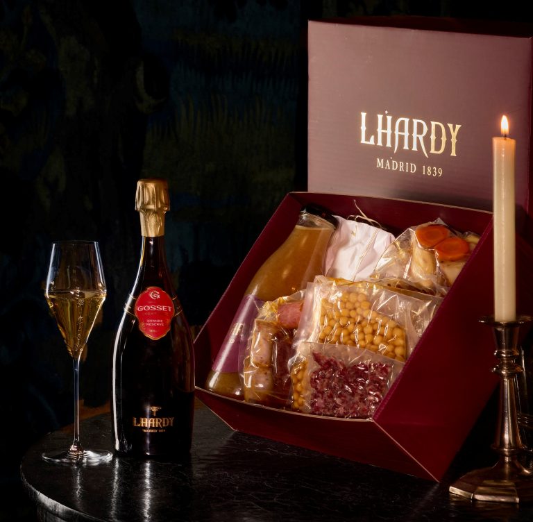 La caja contiene nuestro emblemático Cocido de Lhardy para dos personas, listo para disfrutar en casa acompañado de una botella de Champagne Gosset Lhardy.